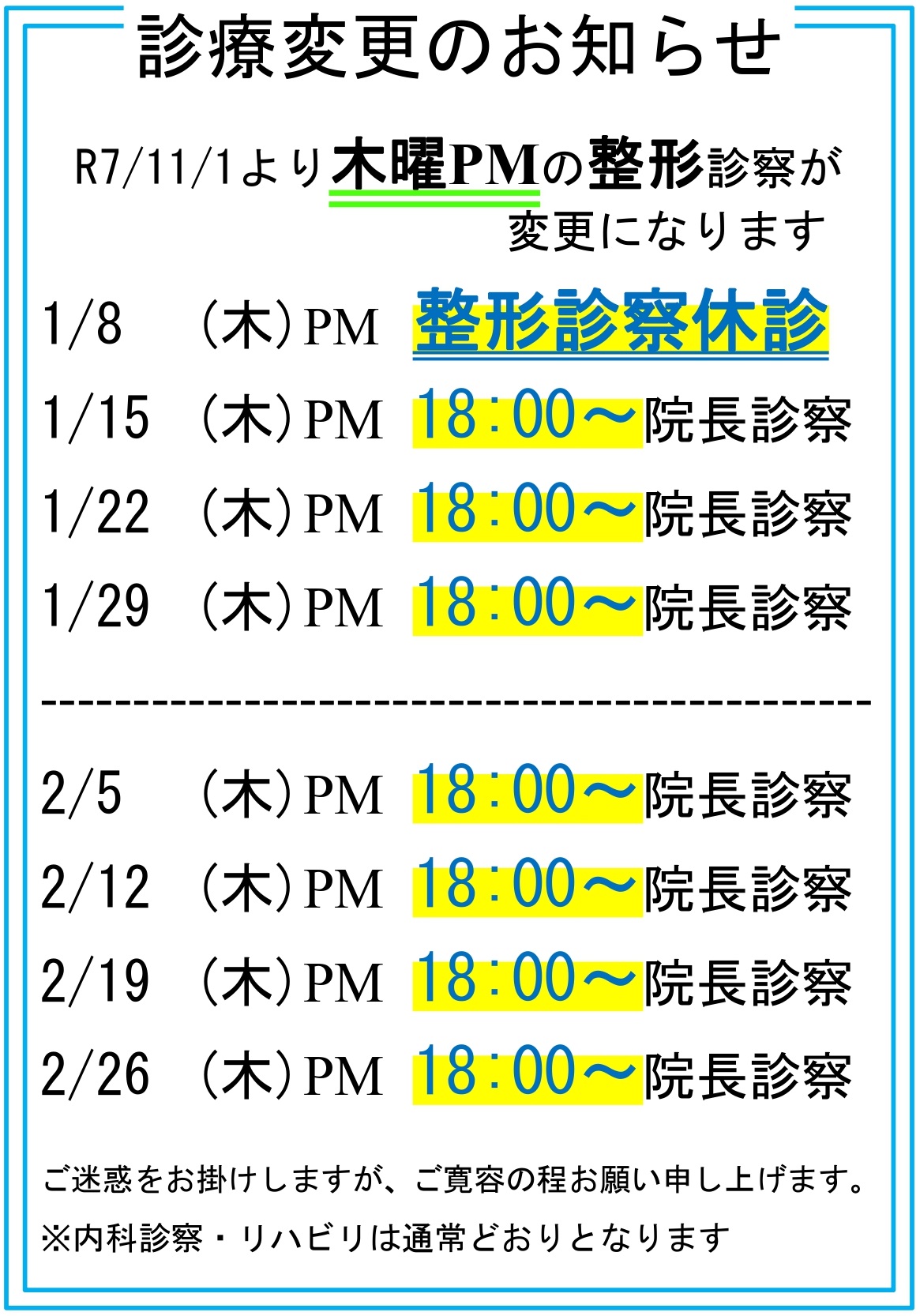 1月・2月木曜日の整形外科の診療変更